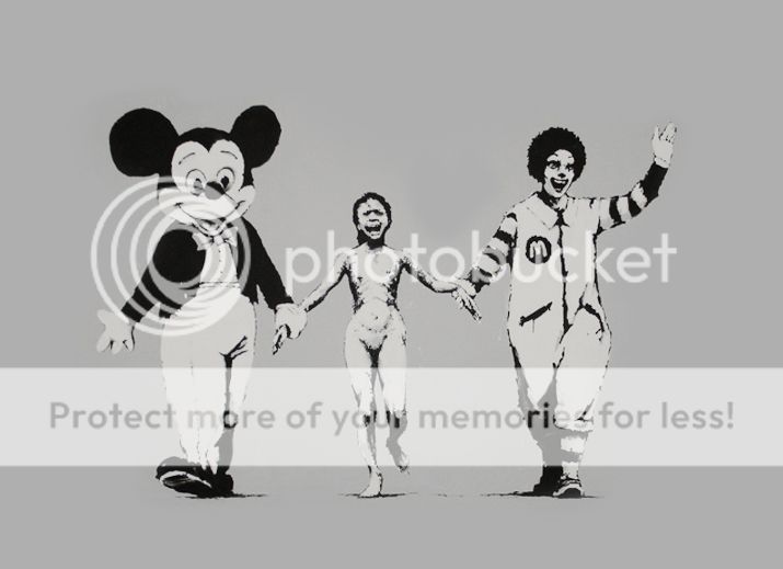 Banksy art is focused on combining images (often well known images) in a surprising, shocking, and usually political context. I feel that his choice of image combination, along with the context of where he may display his work is applicable to this class. After all, his work to assemble separate pictures with stencils are not that much different then photoshoping a few images together.